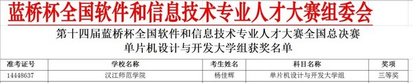 日前,第十四届“蓝桥杯”大赛全国总决赛成绩揭晓,beat365官方网站杨佳辉同学喜获电子类(单片机设计与开发大学组)三等奖的好成绩。