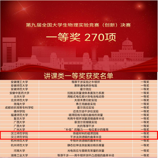 11月25日-26日,第九届全国大学生物理实验竞赛(创新)决赛在重庆大学虎溪校区成功举行,经过紧张激烈的角逐,beat365官方网站3支队伍斩获讲课类一等奖2项、三等奖1项,我校荣获优秀组织奖,创造了学校参加全国大学生物理实验竞赛以来的最好成绩。