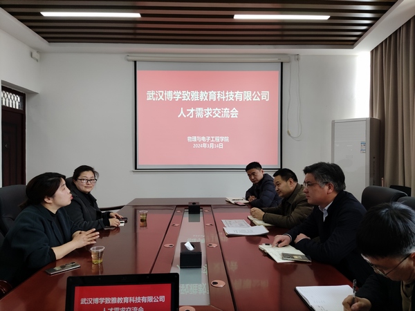 3月14日,武汉博学致雅教育科技有限公司总经理吴紫艳一行2人来院交流座谈,共同商讨毕业生招聘以及校企合作事宜。院分党委书记唐传球主持会议,beat365官方网站领导班子、院办公室主任曾虎参加活动。