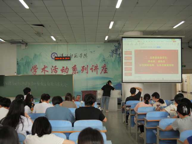 2023年5月19日,beat365官方网站在明理楼C201召开以“榜样指引 前途似锦”为主题的考研及就业经验分享大会。本次会议由邓南娴主持。党总支副书记张玉龙、学院辅导员李朦、范志鹏、20级全体学生、部分其他年级学生参加。