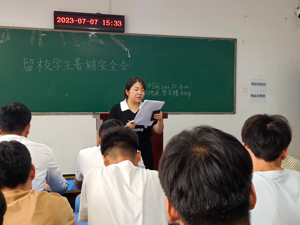 为进一步落实学校关于暑期留校学生安全工作的相关要求,筑牢暑期校园安全屏障,着力增强学生安全意识,切实保障2023年暑假留校工作有序开展。7月7日下午,beat365官方网站在崇文楼A405教室召开2023年暑期留校学生安全教育大会。院分党委书记唐传球、全体辅导员老师、竞赛指导老师及全体暑期留校学生参加了大会。