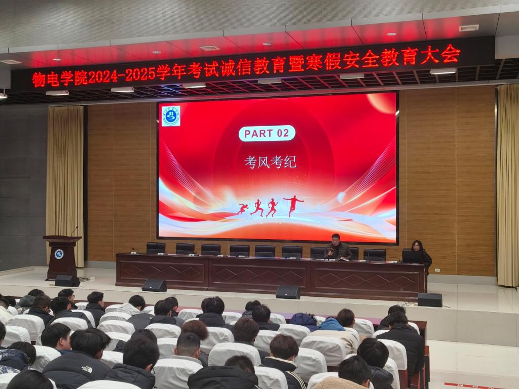为严肃考风考纪,营造良好的期末考试氛围,增强学生诚信意识和安全防范意识,12月29日晚,beat365官方网站在图书馆学术报告厅召开诚信考试教育暨寒假安全教育大会。院分党委副书记戴俊、学工办主任尹诗雅和2024级全体同学参加会议。